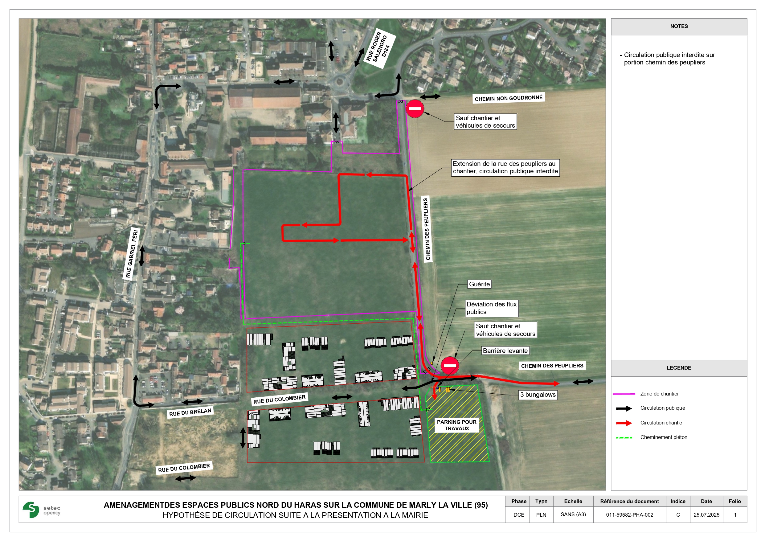 L’accès principal au chantier s’effectuera par le Chemin des Peupliers. En raison de l’étroitesse de cette voie et de la fragilité de ses accotements, la cohabitation entre les véhicules de chantier et la circulation habituelle présente des risques de sécurité que nous ne souhaitons pas prendre. En conséquence, et afin de protéger les riverains et les usagers, la municipalité a pris la décision de fermer à la circulation le tronçon du Chemin des Peupliers situé à l’est du Haras (portion de 400m entre la rue du Pré et la rue du Colombier). A l’issue du chantier, le Chemin des Peupliers sera entièrement remis en état.