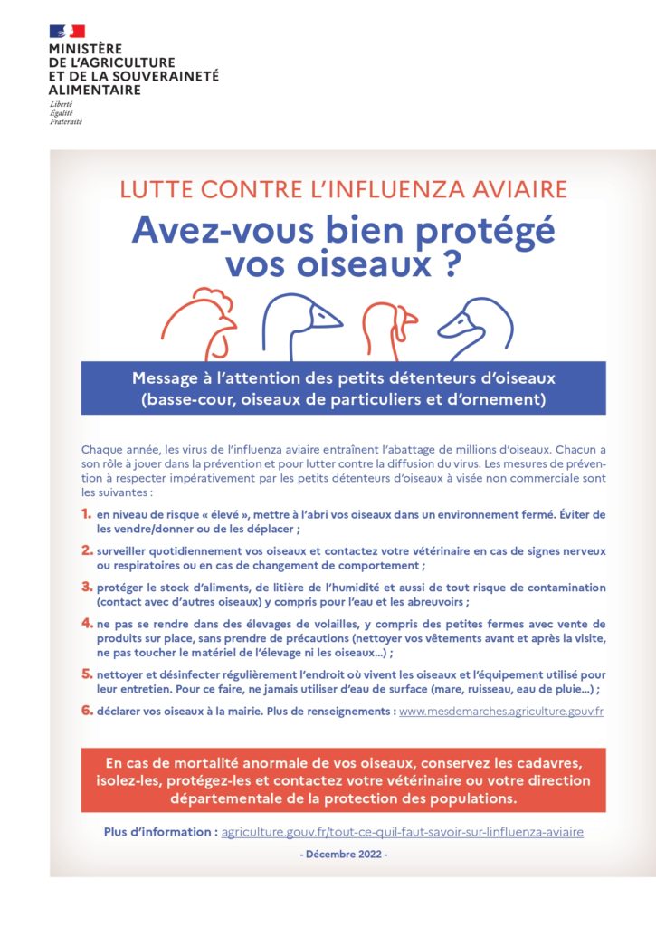 Pour en savoir plus, rendez-vous sur https://agriculture.gouv.fr/tout-ce-quil-faut-savoir-sur-linfluenza-aviaire