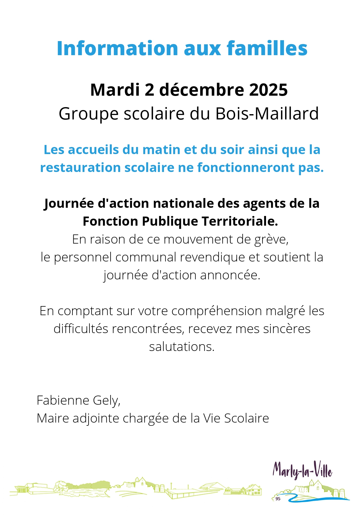 - Groupe scolaire du Bois-Maillard : Les accueils du matin, du soir et la restauration scolaire élémentaire et maternelle seront fermés,