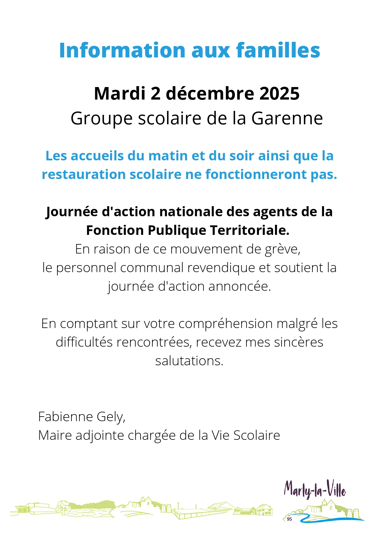- Groupe scolaire de la Garenne : Les accueils du matin, du soir et la restauration scolaire élémentaire et maternelle seront fermés,