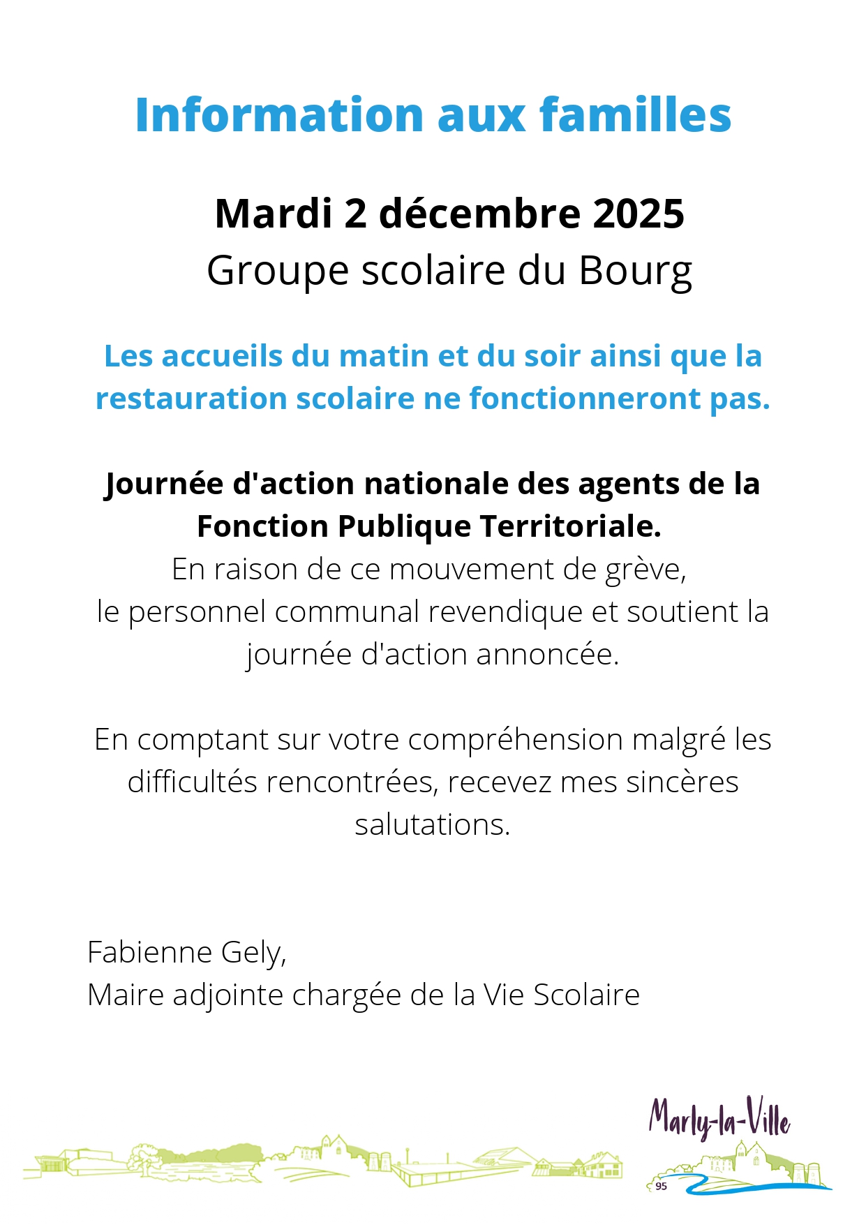En raison d’un mouvement de grève, concernant la journée du 2 décembre 2025, les accueils municipaux pris en charge par le service Enfance/Jeunesse ne seront pas assurés, à savoir :