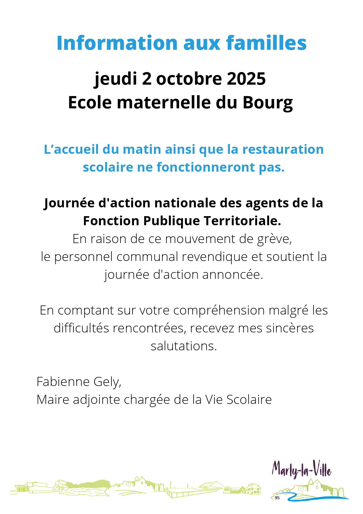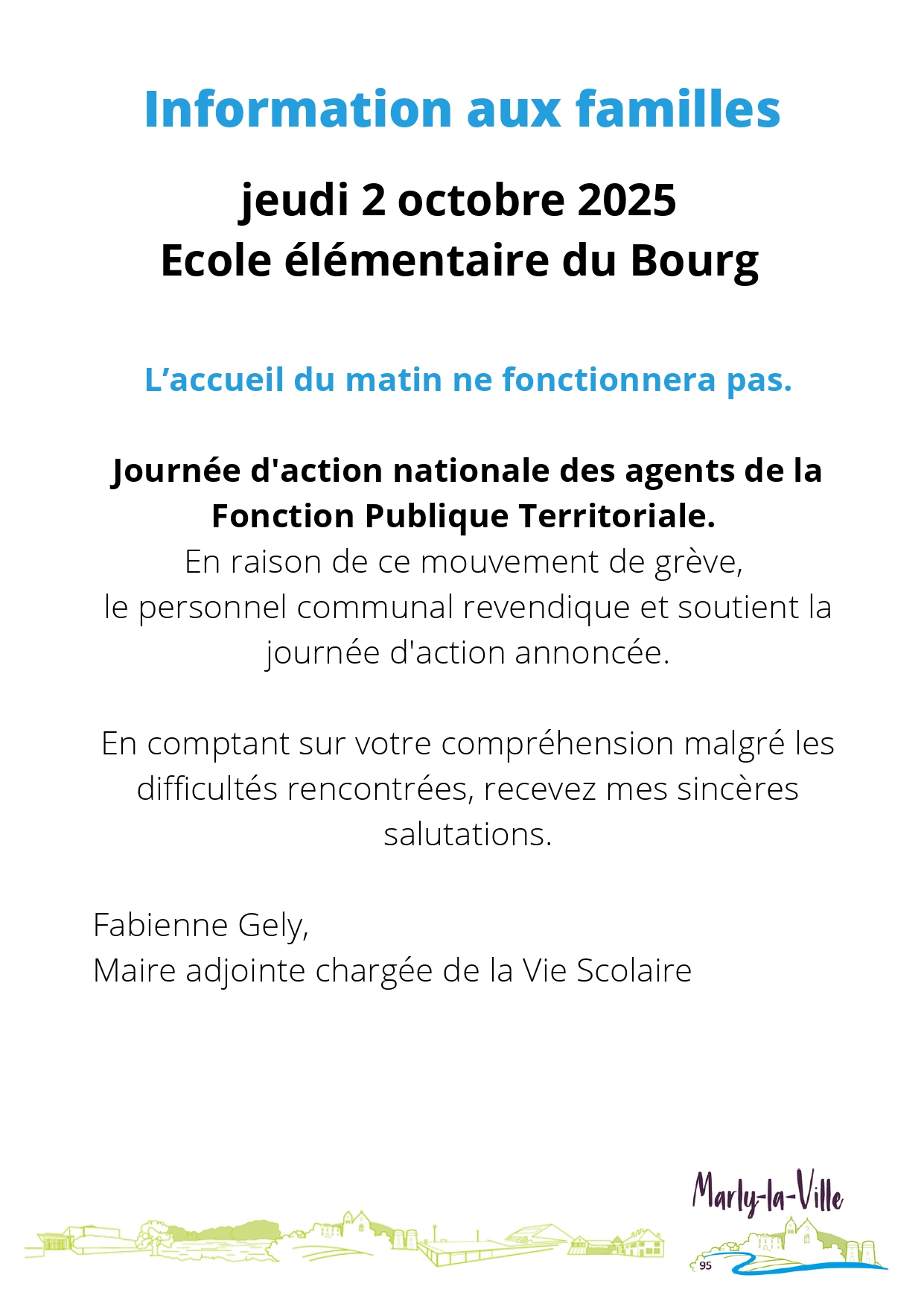 En raison d’un mouvement de grève, concernant la journée du 2 octobre 2025, les accueils municipaux pris en charge par le service Enfance/Jeunesse ne seront pas assurés, à savoir :